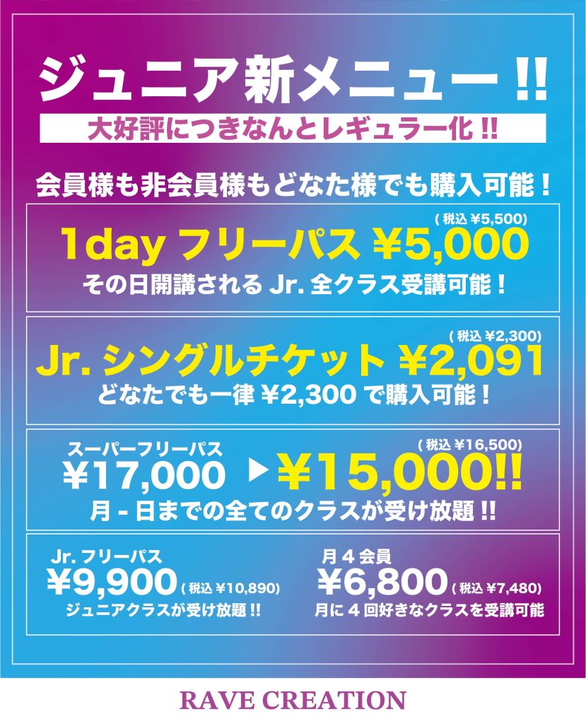 緊急開催‼️🔥 インストラクターAROE @stardumia 大活躍中のダンサーAROEのマスタークラスがRAVECREATIONにて再び受講可能!!🔥 お見逃し無く!!!✨ RAVEフリーパス会員はマスタークラスを追加料金なしで受講可能!! 【Lesson】 10/13 Mon. 16:00-17:30 【受講対象】 《会員/非会員/中学生以上》 【会員様受講方法】 ▶︎フリーパス全種類→追加料金なし✨ ▶︎月4コース→マスタークラスチケット特別プラス¥2,500✨ ▶︎チケット会員→マスタークラスチケット¥3,500 ※マスタークラスチケット購入後のキャンセルは返金不可 【非会員様予約方 […]