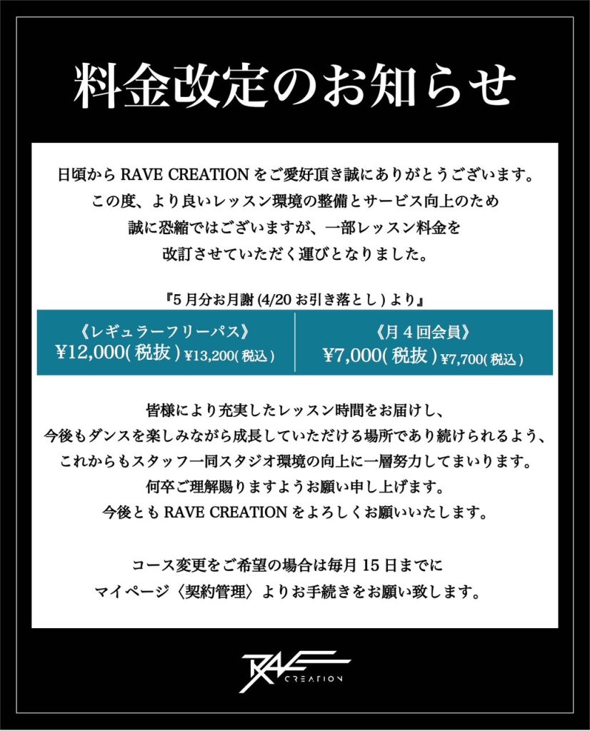 2026年5月度より(4/20お引き落とし分)料金の改定・コースのリニューアルを実施させていただきます。 近年の運営コストの上昇や、レッスン環境・コース内容のさらなる向上を目的とした改定となります。 最高の環境でハイクオリティなダンスレッスンを提供できるよう、スタッフ一同努めてまいります✨ 何卒ご理解を賜りますようお願い申し上げます。 RAVE CREATION