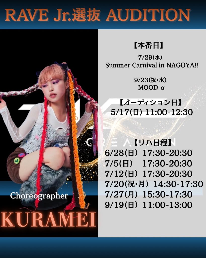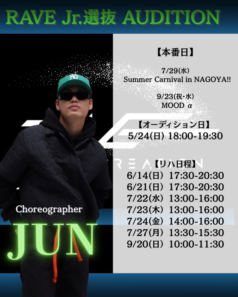 情報解禁💥 【Jr.選抜AUDITION開催決定‼️】 昨年も大盛り上がりだった “RAVE CREATION Jr選抜!” 今年も選抜オーディションを開催することが決定致しました!🔥 熱い夏を共に駆け抜けるメンバーをオーディションで選抜します! 🔴3/10(火)20:00〜エントリー開始!! スケジュールを空けてお待ちください! ✅コレオグラファー KURAMEI / GIRLS @_kmei_ ✅本番日 ①Summer Carnival in NAGOYA!! 7/28(火) リハーサル 7/29(水) 本番 📍オアシス21 特設ステージ ②MODE α 9/21(祝・月) リハーサル※仮 […]